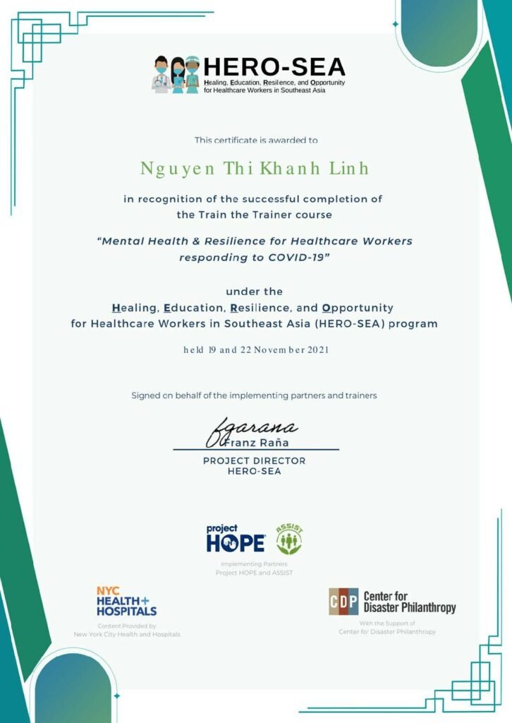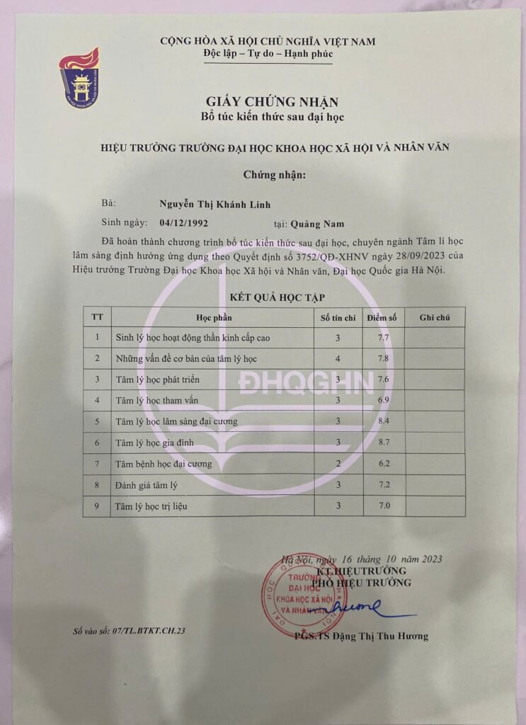 - 4/2023 – 9/2023: Trường Đại học Khoa học Xã hội và Nhân văn – Chương trình đào tạo sau đại học ngành Tâm lý lâm sàng